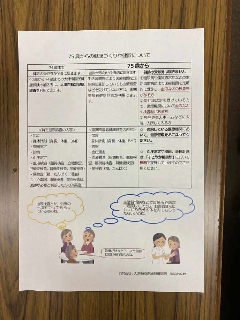 74歳までは大津市が全ての市民に健康診断の無料券を発送しているので、お医者さんにかかっている人もかかっていない人も一律に無料券が届きます。